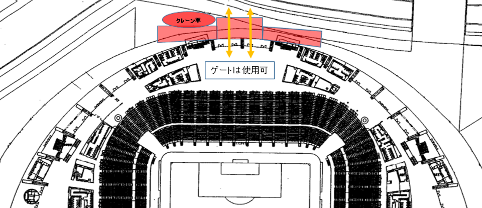 2. スタジアム外周部、鉄骨階段の塗装工事の関係で、一部のゲートは足場が組まれ狭くなる場所がございます。