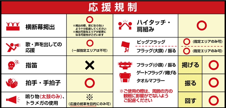 • 応援規制緩和に関する運用によって設けさせていただいているルールが守られない、または「フラッグを振る、タオルマフラーを振るもしくは回す」行為が、その他の観戦ルールの遵守を妨げるなど運営に支障を来たすと判断した際は、今後の試合で運用を取り止め・中止する場合がございます。