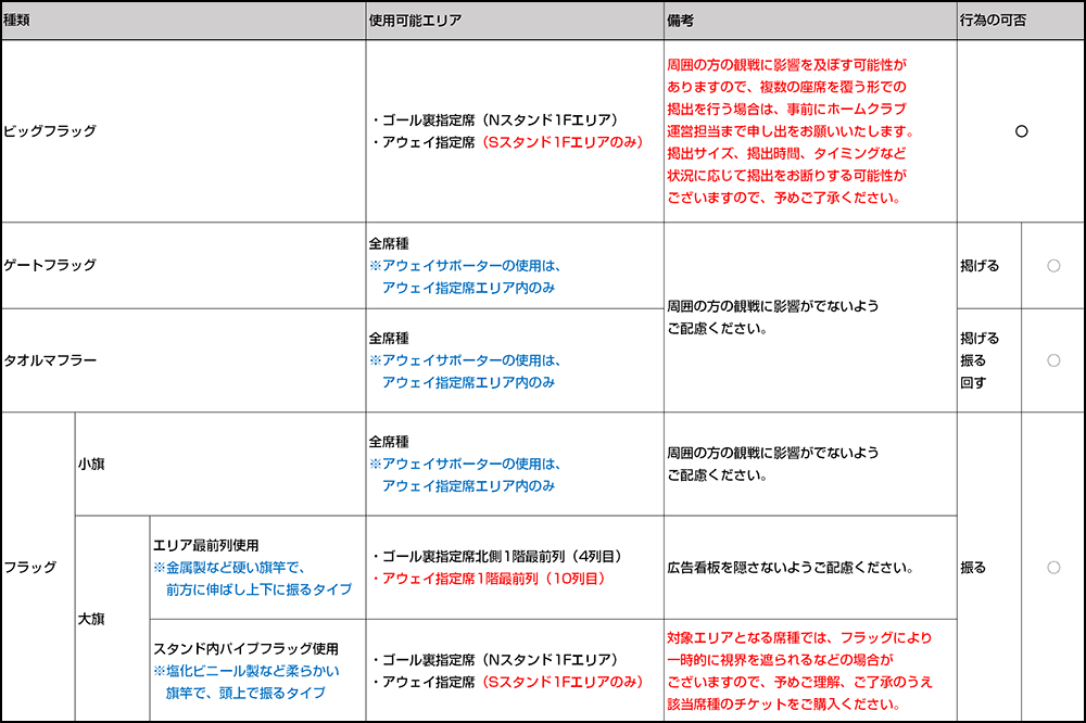 • フラッグ等の使用に関する運用につきまして、「大旗を含むフラッグを振る」、「タオルマフラーを振る、もしくは回す」行為、「ビッグフラッグの掲出(観客がいる複数の座席を覆う形での旗類の使用)」が、「アウェイ指定席」のみ可能となります。大旗およびパイプフラッグは、さらに使用可能なエリアが指定されておりますので、その範囲内でのみご使用いただきますようお願いいたします。<br>
