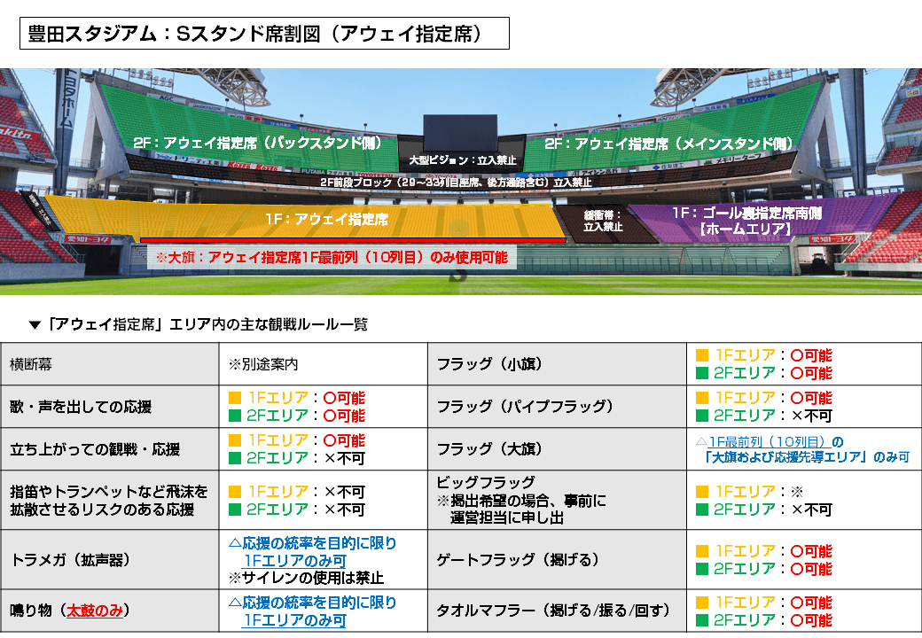 • アウェイ指定席(Sスタンド1Fエリア)は「立ち上がっての観戦・応援」容認エリアとさせていただきます。立ち上がっての観戦が強制されるものではございませんが、同席種をお買い求めのお客様は、周りの座席で立ち上がって観戦されるお客様がいらっしゃることを予めご理解くださいますようお願いいたします。
